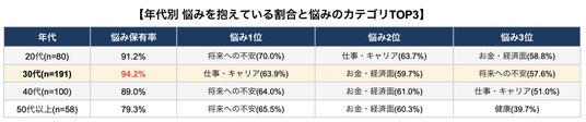 ~現代人の悩みに関する意識調査~「お金」でも「仕事」でもなく、漠然とした「将来への不安」がトップに30代の悩み保有率は94.2% 最も悩みを抱える世代が明らかに