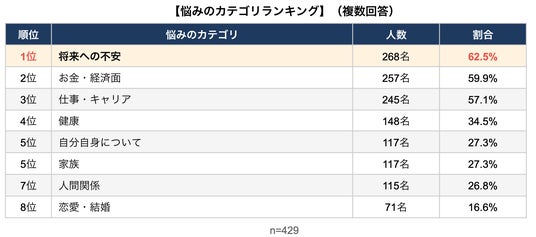 2.悩みのカテゴリ1位は「将来への不安」(62.5%)「お金」「仕事」を上回る