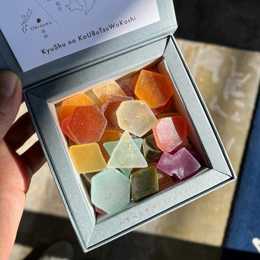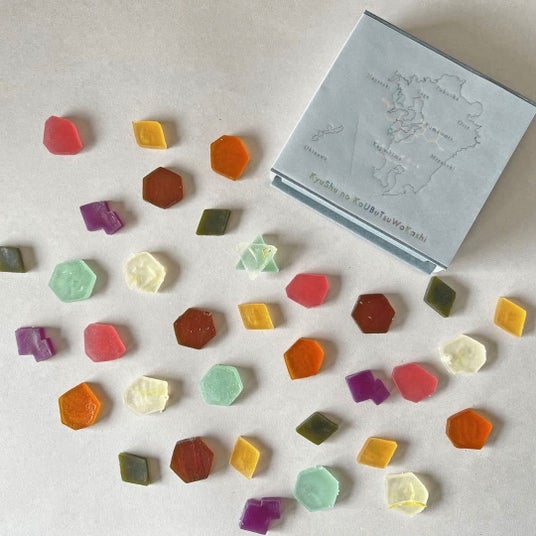 福岡からものづくりを発信しているハラペコラボが、九州沖縄の美味しいをお菓子で届けたいと開発した、濃厚な味が自慢の琥珀糖。シーグラスのような風合いが魅力です。