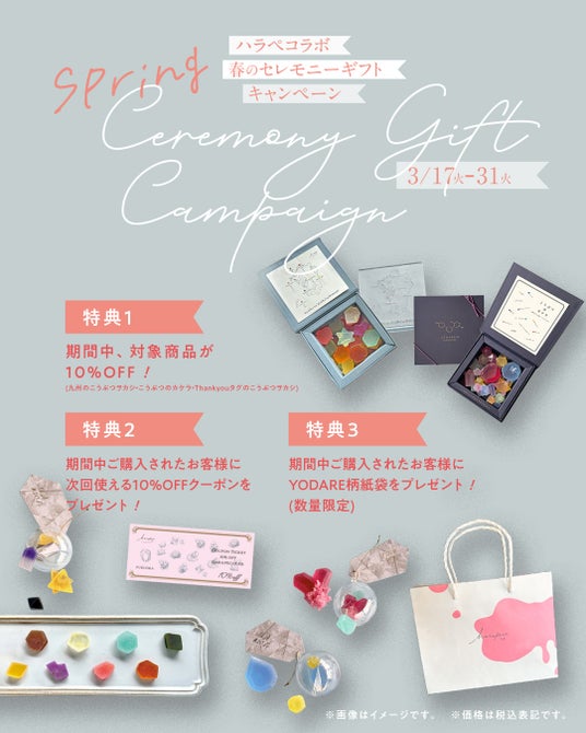 「ArtなFoodであそぶ」をテーマにプロダクトを展開するメルティングポットハラペコラボ株式会社(所在地:福岡県福岡市、以下 ハラペコラボ)は、卒業・送別・新生活など「感謝」を伝える機会が増える春のセレモニーシーズンにあわせ、2026年3月17日~3月31日まで、期間限定の「春のセレモニーキャンペーン」を開始いたします。本キャンペーンでは、春のギフトに最適な人気商品3種を10%オフの特別価格でご提供いたします。また、先着100名様に限定デザインの【yodare柄紙袋】をプレゼント。さらに、ご購入いただいた方には次回のお買い物で使えるクーポンを配布します。ハラペコラボは本企画を通して、「贈る・受け取る」という一度きりの体験にとどまらず、感謝の気持ちが連鎖していく新しいセレモニーのかたちをご提案します。
