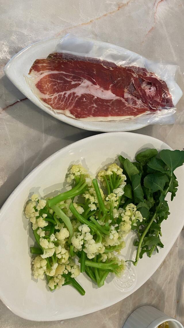 イベリコハム、カリフローレとルコラ。チーズ(ゴルゴンゾーラ、タレッジョ)、