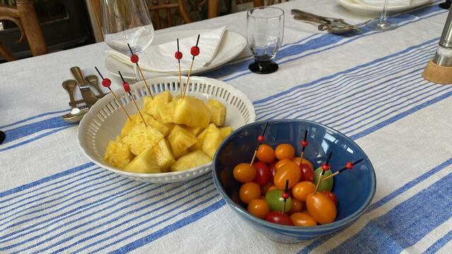 パイナップル(久しぶりの登場)、ミニトマト、ラディッキオのオーブン焼き、プンタレッレのサラダ。
