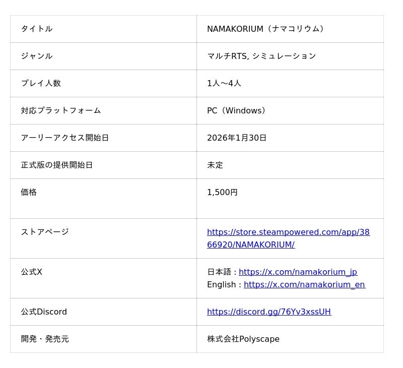 NAMAKORIUMは2026年1月30日(金)からのアーリーアクセス版提供を記念し、リリースディスカウントを実施しておりました。今回はリリースディスカウント以来初であり、NAMAKORIUMでは最大となる30%の割引をSteam Spring Sale期間にあわせて実施いたします。<割引期間>