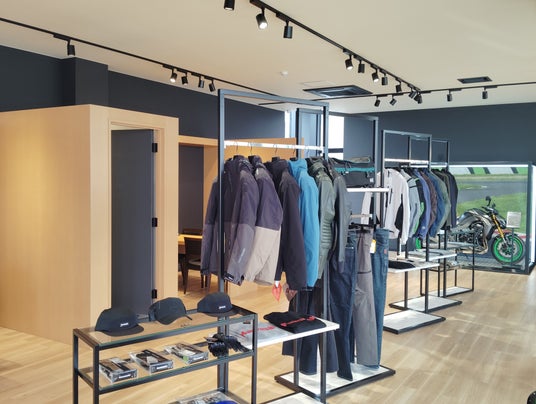 木目調のフロアと白い天井が織りなす明るい店内。モーターサイクルとプラザアパレルがゆったりと展示され、どなたでも楽しめる空間となっています。