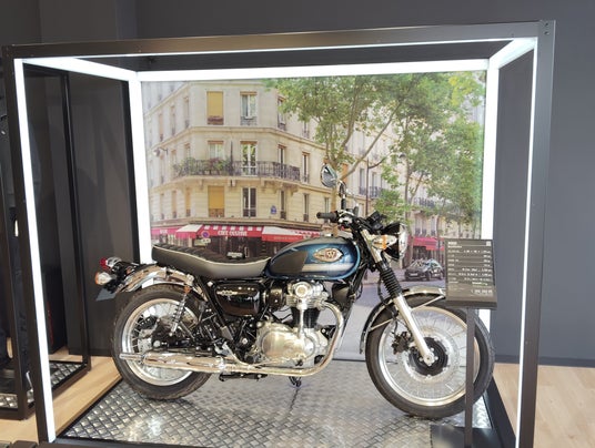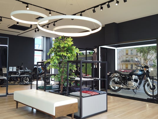 新たなオーナーを待つモーターサイクルたちが、ケージの中で静かに眠りについているイメージを光の枠で創出。カワサキプラザならではのアイコニックポイントの一つです。