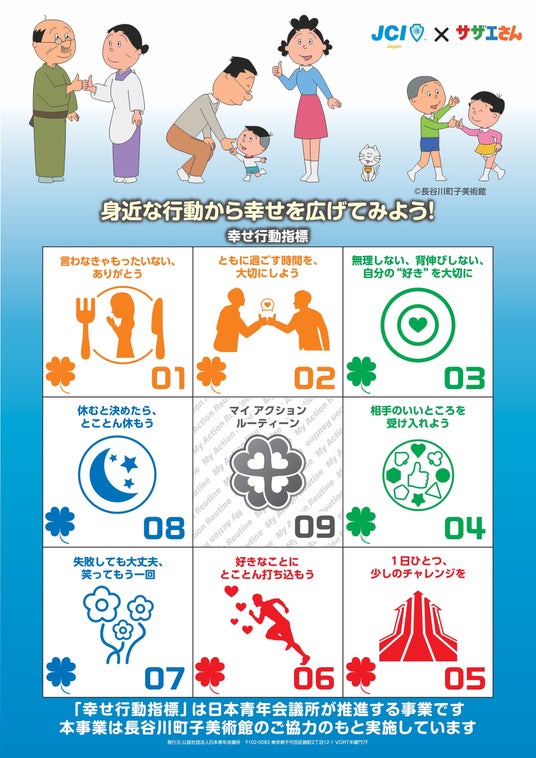 公益社団法人日本青年会議所(会頭:加藤 大将、所在地:東京都千代田区麹町2丁目12-1 VORT半蔵門7F、以下「日本 JC」)では、日本の幸福度向上を目指し、2026年度はさまざまな取り組みを行っています。その一つとして日本JCが推進する「幸せ行動指標」が、この度、国民的アニメ「サザエさん」と新たにコラボレーションいたしました。新学期に向け、3月30日(月)より順次、全国約1,000の小学校への校内掲示を進めていきます。