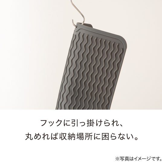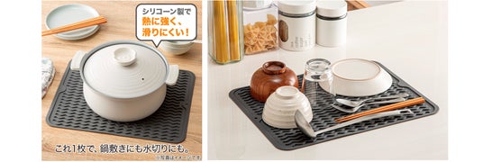 この商品は、調理中のおたま・ターナーなどの一時置きはもちろん、耐熱温度260℃まで対応しているので調理後の鍋敷きや水切りマットとしてもご使用いただけます。また、マット本体に溝があるので水切りマットとしても便利です。これひとつで、作業工程に合わせて多用途に使い方を切り替えられます。