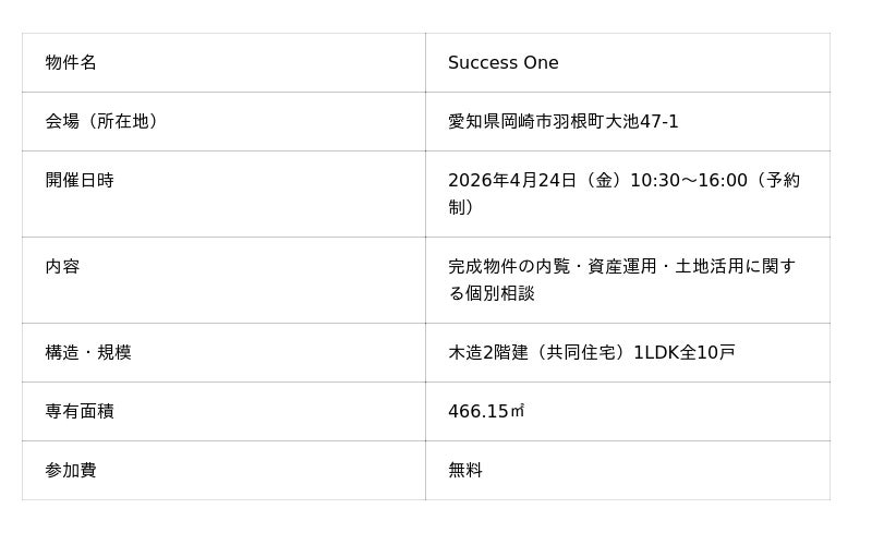 ハタス株式会社(愛知県刈谷市、代表取締役社長:塚本龍生)は岡崎市羽根町に完成した賃貸アパート「Success One」の完成内覧会を、2026年4月24日(金)に開催いたします。土地活用・資産運用をご検討中の地主様・オーナー様に、実際の建物を体感していただける機会として、この度の内覧会を開催いたします。