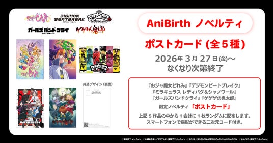 3月27日(金)より、AniBirth池袋PARCO店にてお買い上げのお客様へ、1会計につき1枚、ポストカードをプレゼントいたします。