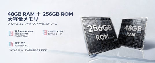 メモリ & ストレージ: 48GB RAM (12GB + 最大36GB拡張) / 256GB ROM (最大2TB拡張)