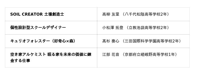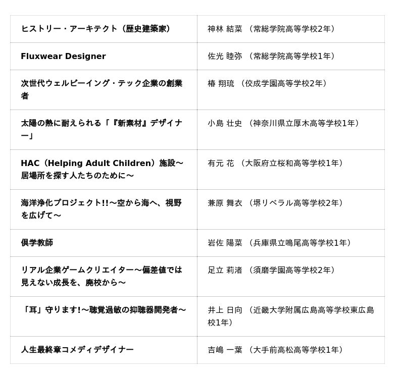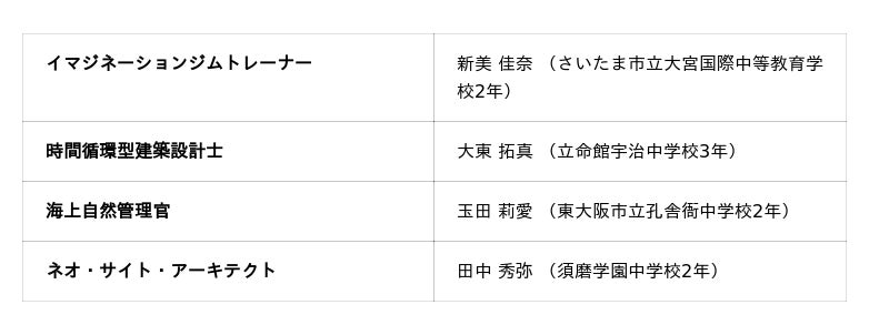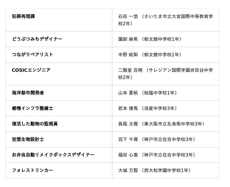 高校生を対象に、20年後の未来における”私の仕事”のアイデアを募る部門。今年度は2,714作品、これまでの参加者数は3万人を超えました。受賞をきっかけに、イノベーションを志す仲間でユニットを組成して、企画実現のためにナレッジキャピタルの持つ起業家や専門家などのコミュニティに積極的に参加するなど、受賞後の活動も活発化しています。■グランプリ 1点
