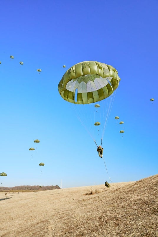 空挺団の隊員たちは見事な落下傘降下を披露した。落下傘降下は作戦成功のための手段の1つ。目標地域に次々と着地した隊員たちは続けて戦闘行動の準備を進めるのだ