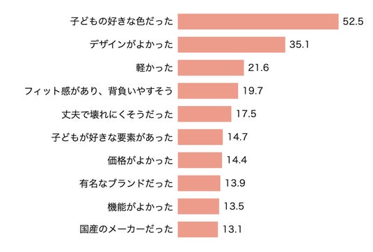 昨年同様にランドセル購入の決め手は「子どもの好きな色かどうか」が52.5%で最も重視されており、引き続き“色”が重要な判断軸となっています。次いで「デザインがよかった」が35.1%と続き、見た目に関する要素が購入決定に大きく影響している傾向が定着しています。近年はカラーバリエーションの広がりに加え、刺繍やステッチ、金具など細部のデザインにも各社の工夫が見られ、お子様の好みや個性を重視した選び方が広がっています。