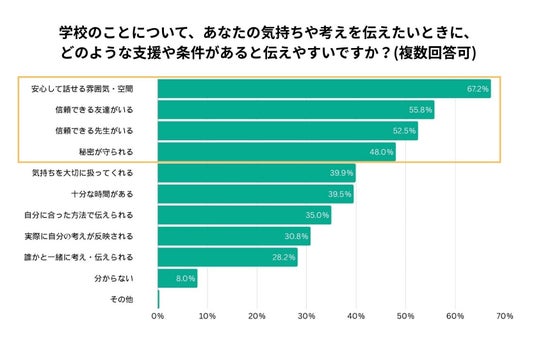 さらに、「学校のことについて、あなたの気持ちや考えを伝えたいときに、どのような支援や条件があると伝えやすいですか?」という設問に対しては、全体の約7割が「安心して話せる雰囲気・空間」、続いて約半数以上の生徒が「信頼できる友達や先生がいる」ことや「秘密が守られる」と回答しました。