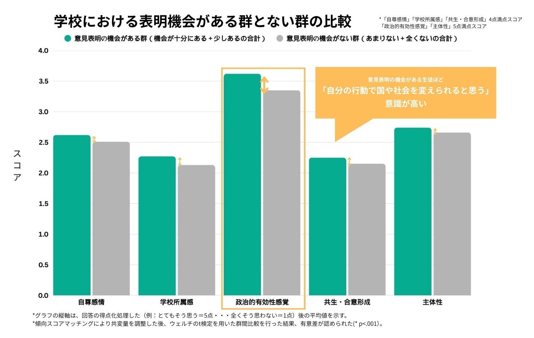 学校における意見表明の機会の有無と、「自尊感情」「学校所属感」「政治的有効性感覚」「共生・合意形成」「主体性」の関係について見てみると、特に学校に関する意見表明の機会がある学校の生徒ほど「自分の行動で、国や社会を変えられると思う」といった政治的有効性感覚が高いという傾向が明らかになりました。