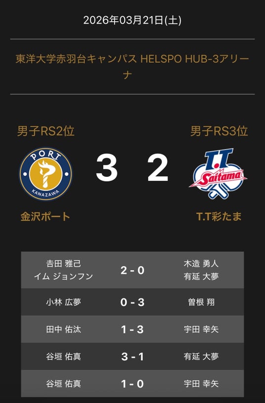 ノジマTリーグ 2025-2026シーズン 公式戦 3月21日開催 男子セミファイナル 金沢ポート vs T.T彩たま の試合は、3-2で金沢ポートが勝利しました。