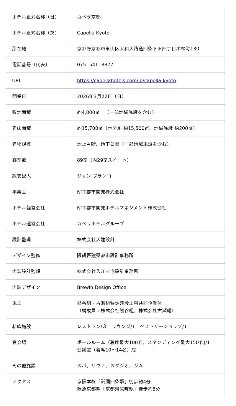 「本プロジェクトは、宮川町お茶屋組合や新道自治会をはじめとする地域の皆様の多大なるご理解とご協力のもと実現いたしました。この宮川町という歴史と文化が息づく特別な場所において、『街の記憶を受け継ぐこと』と『新たな価値を創造すること』を大切にしながら、カペラ京都が、お客様にとって心に残る場所となるとともに、地域の皆様に誇りに思っていただける存在となることを願っております。」