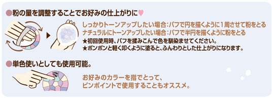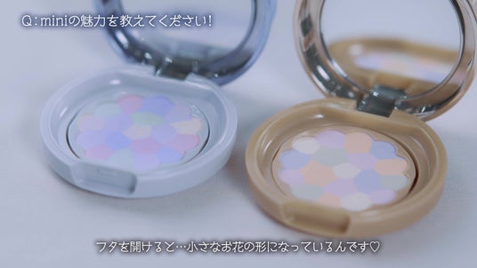 パウダーと容器デザインは通常サイズと同じ仕様で、中皿にはかわいらしいお花型を採用しています。手のひらサイズで持ち歩きしやすいので、外出先でのお直しパウダーにおすすめ!