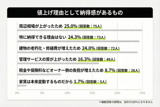また、値上げ理由の納得感では周辺相場が上がったため25.0%(75人)、建物の老朽化・修繕費が増えたため24.0%(72人)など外部環境・維持コストが上位に入る一方で、特に納得できる理由はない24.3%(73人)も同水準となり、値上げの伝え方・説明の不足が不満につながる可能性が示唆されます。