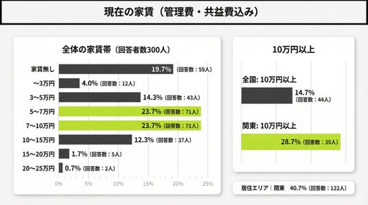 ・家賃10万円以上は14.7%(44人)。関東に限ると28.7%(35人)