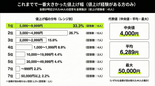 レンジ別では5,000~9,999円が最多で、次いで3,000~4,999円が続きました。個別の金額としては3,000円が最多で、数千円単位の値上げが典型像となっています。