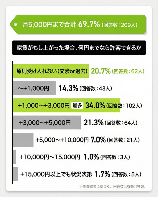 家賃調査300人:値上げ許容は月5,000円まで69.7%(209人)――一方、2割が原則受け入れない(交渉or退去)20.7%(62人)。納得理由は周辺相場25.0%(75人)も、特に納得できる理由はない24.3%(73人)が拮抗