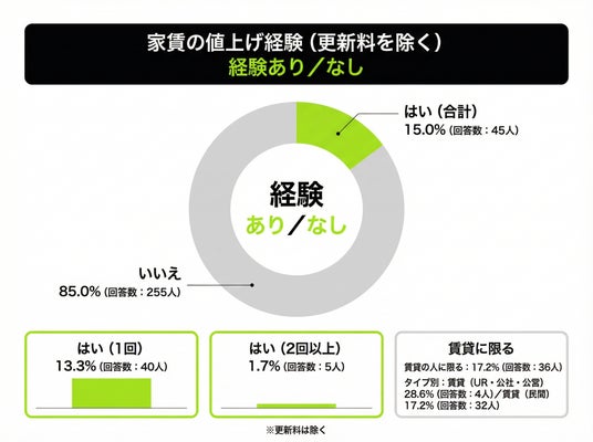 ・家賃の値上げ経験は15.0%(45人)。住まいが賃貸の人に限ると17.2%(36人)