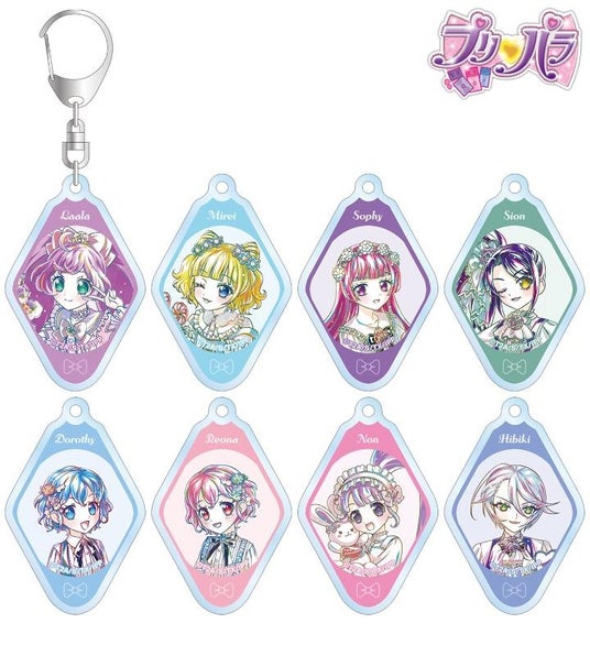 真中らぁら、南みれぃ、北条そふぃ、東堂シオン、ドロシー・ウェスト、レオナ・ウェスト、真中のん、紫京院ひびきのイラストを新たなタッチで魅力的に表現し、アクリルキーホルダーに仕上げました。
