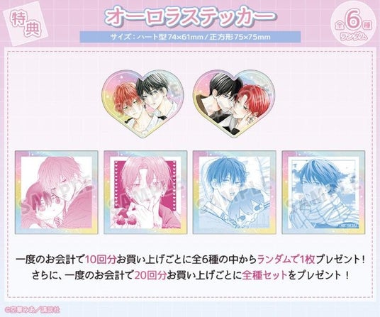 一度のお会計で10回分ご購入ごとに特典オーロラステッカー(全6種)の中からランダムで1枚、20回分ご購入ごとに全種セットプレゼント!