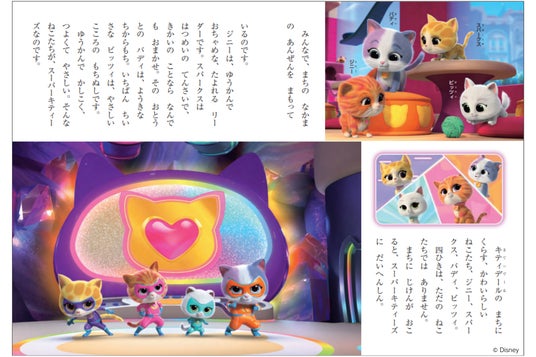 物語に登場するのは、キティデールの街に住む4匹の子猫、ジニー、スパークス、バディ、ビッツィ。ただのかわいい猫たちと思いきや、ひとたび事件が起こるとスーパーキティーズに変身! みんなを助けるために、大活躍するおはなしです。