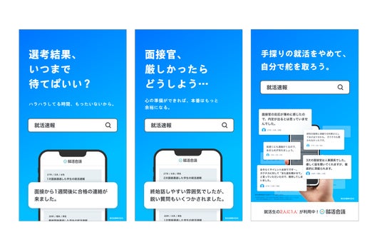 「選考結果がわかるまで心が落ち着かない」「選考本番まで何が起きるかわからない」といった就活生が抱きがちな不安を和らげ、誰もが万全の状態で自分らしく選考に臨めるという就活速報の強みを、実際の操作画面や利用シーンが直感的に伝わるデザインで表現しました。