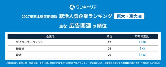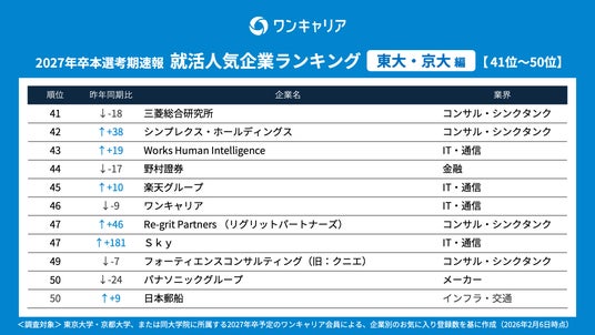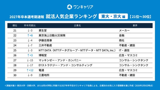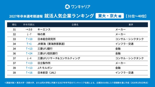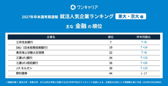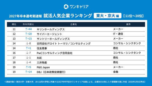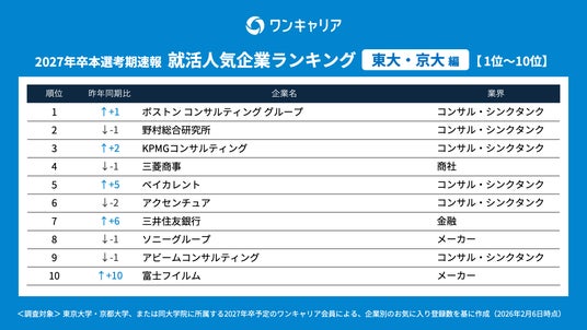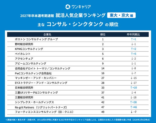 就活支援サービス「ワンキャリア」を展開する株式会社ワンキャリア(本社:東京都渋谷区、代表取締役社長 執行役員CEO:宮下 尚之、以下「ワンキャリア」)は、「ワンキャリア 就活人気企業ランキング【東大・京大編】(27卒本選考期速報)」を発表しました。