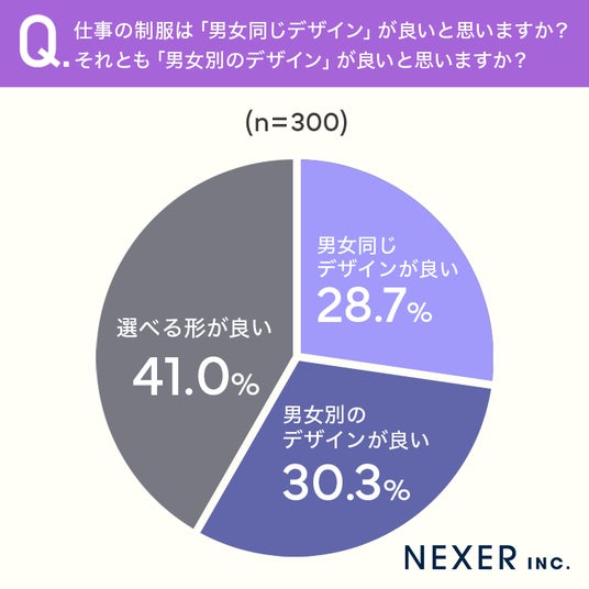 次いで「男女別のデザインが良い」が30.3%、「男女同じデザインが良い」が28.7%でした。