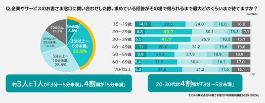 ・回答を得られるまでの許容時間は「3分以上~5分未満」が最多(32.8%)。41.6%が「5分未満」を希望し、特に20~30代で短時間志向が見られる。