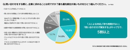 ・問い合わせで求めることは「人による対応」が最多(23.3%)。10~30代は時間・利便性重視、40代以上は人対応重視。