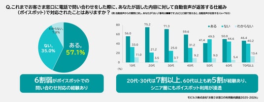 ・ボイスボット利用経験は57.1%。20代(75.2%)・30代(71.3%)は7割超、60代(50.0%)・70代以上(46.4%)も約半数。