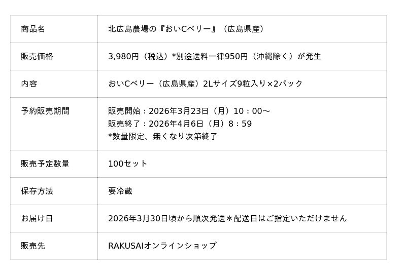 楽彩株式会社(本社:東京都足立区/代表取締役社長:大崎善保)は、2026年3月23日(月)より北広島農場さんの『おいCベリー』(広島県産)を100セット限定で予約販売いたします。本商品は、「オーガニックエコフェスタ」にて最優秀賞を受賞した実績を持つ、トップクラスのクオリティを誇るいちごです。一般的な品種と比較してビタミンCが約1.6倍と豊富に含まれているだけでなく、産地直送ならではの、滴るような果汁と濃厚な甘み、そして芳醇な香りを鮮度そのままにお届けします。RAKUSAIがお届けする今季最後の産直いちご。100セット限定という特別な一箱で、春の訪れとともに至福のひとときをお楽しみください。