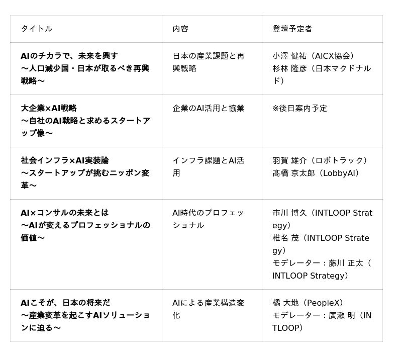 本イベントでは、日本の産業課題とAI活用をテーマに5つのパネルディスカッションを予定しています。一部登壇者は調整中のため、順次発表予定です。