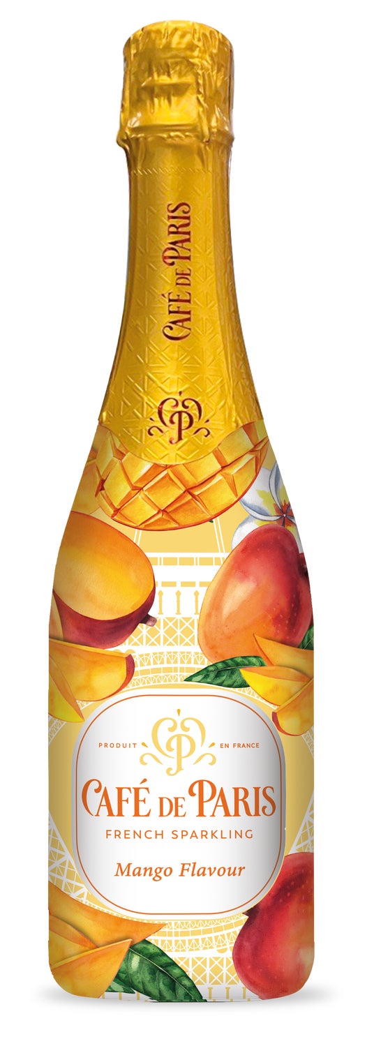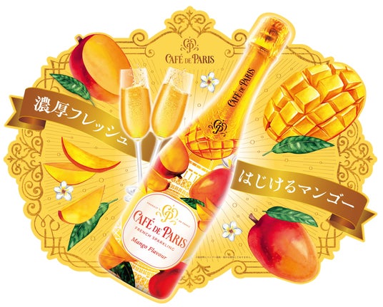 「カフェ・ド・パリ マンゴー」は、熟したマンゴーのジューシーな果実感と、スパークリングの軽やかな泡が織りなす贅沢な味わいが特徴です。ボトルは、心が躍るようなフルラッピングパッケージのデザインで、花の都パリのアートやカルチャー、ファッション、ライフスタイルを映し出し、洗練された美しさを表現しています。