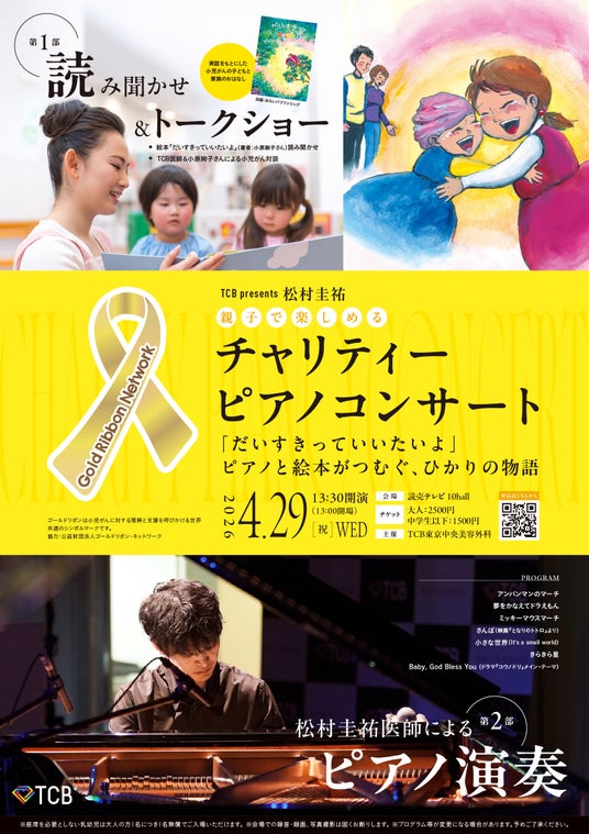 タイトル:TCB presents 松村圭祐チャリティーピアノコンサート ~「だいすきっていいたいよ」 ピアノと絵本がつむぐ、ひかりの物語~日時:2026年4月29日(水・祝) 13:30開始(13:00開場)