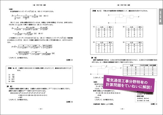 第一次検定はマークシート方式で、その大半は、4つの選択肢から「適当でないもの」や「誤っているもの」を選ぶ問題です。たとえば、「誤っているもの」を選ばせる問題の場合、正答肢以外の残りの選択肢はすべて正しい文章であり、そのまま知識として覚えておけば、1問解くごとにさまざまな知識が身につき、学習効率は通常の4~5倍にもなります。そのため、本書では正答肢とその理由を解説するだけでなく、正答肢以外の選択肢についても詳しく解説しています。また、電気通信工学の分野では、磁界の強さ、回路の抵抗値、コイル間のインダクタンス、論理回路、進数変換など、計算を伴う問題が毎年出題されます。本書では、それらの問題について途中計算を含めたていねいな解説を掲載しています。