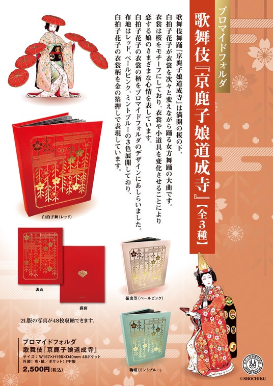松竹株式会社(東京都中央区、代表取締役社長 高槗 敏弘) 事業推進部は、「ブロマイドフォルダ 歌舞伎『京鹿子娘道成寺』」(全3種)を、2026年3月24日(火)より松竹歌舞伎屋本舗にて発売開始いたします。