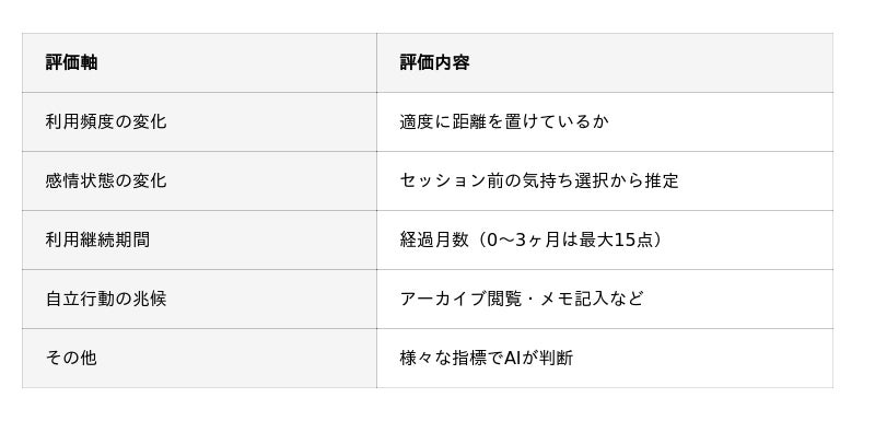 本サービスの最大の特徴であり、依存を生まないための新機能です。AIは以下を含め様々な指標で利用者の心理的回復状態を自動評価し、スコアに応じて「卒業提案」を段階的に表示します。