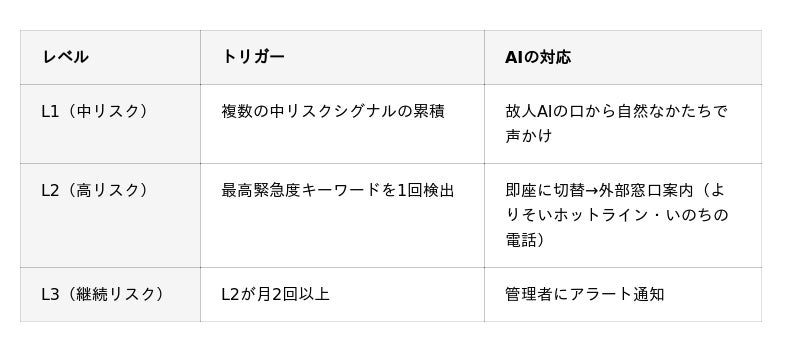 子どもを亡くした親への卒業スコア補正、危機介入時の外部窓口案内、セッション後の余韻モード(大きな余白設計)--これらすべては、「テクノロジーが何をしないか」を徹底的に議論した結果として生まれた機能です。