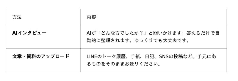 故人のことを「話す」という自然な行為を通じて、あの人の言葉・口癖・価値観・エピソードが自動的に整理されていきます。