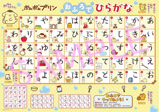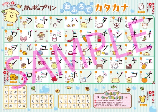 ポムポムプリンと一緒に、ひらがなとカタカナを楽しく学べるおふろポスターが10月15日に発売予定です。本書には、水だけでくり返し貼ってはがせる耐水仕様のポスターが2枚入っています。