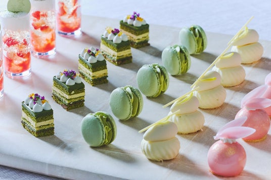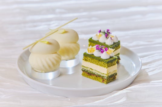 いちごのソースにいちごとシャンパンのジュレを重ね抹茶が香るフォームで仕上げたヴェリーヌ、抹茶のクリームとフレッシュいちごで仕上げた色彩豊かなタルト、さっぱりとしたライムのジュレを忍ばせたいちごのムース、抹茶のガナッシュとミルクチョコレートの層が美しいオペラ、抹茶のジュレと爽やかな柑橘香るホワイトチョコのムース、抹茶のマカロンなどいちごと抹茶のハーモニーを楽しめるスイーツ6種をご用意。