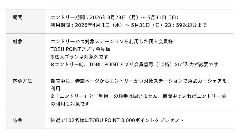 第二弾では、2026年3月23日(月)から5月31日(日)の期間にエントリー、かつ2026年4月1日(水)から5月31日(日)の期間に東武カーシェアをご利用いただいた方の中から抽選で102名様にTOBU POINT 3,000ポイントをプレゼントします。