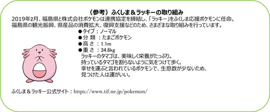 福島県では、平成31年2月に株式会社ポケモンと連携協定を締結し、ふくしま応援ポケモン「ラッキー」とのさまざまな取り組みにより県内の活性化を図っています。