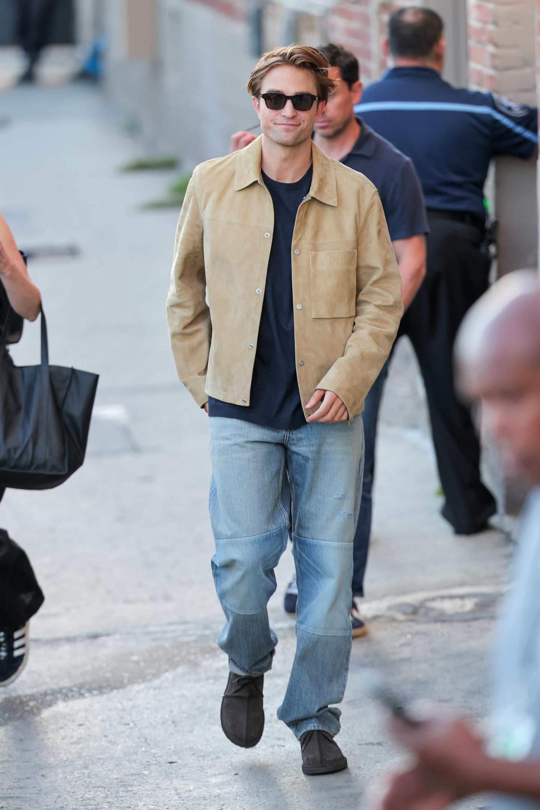 ロバート・パティンソンは、ベージュのレザーオーバーシャツ、ネイビーのコットンTシャツ、ブルーのデニムジーンズに、サングラスを合わせたルックを披露しました。